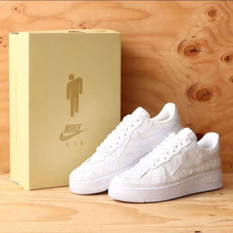 14. $117. 15. $129. Facts. The Billie Eilish x Nike Air Force 1 Low 'Triple White' reunites the Swoosh with the chart-topping pop star on a reworked edition of the sneaker icon. Finished in a pristine blank-slate color scheme, the white textile upper is updated with a mosaic-like design, highlighted by tonal stitching and sewed-on white.