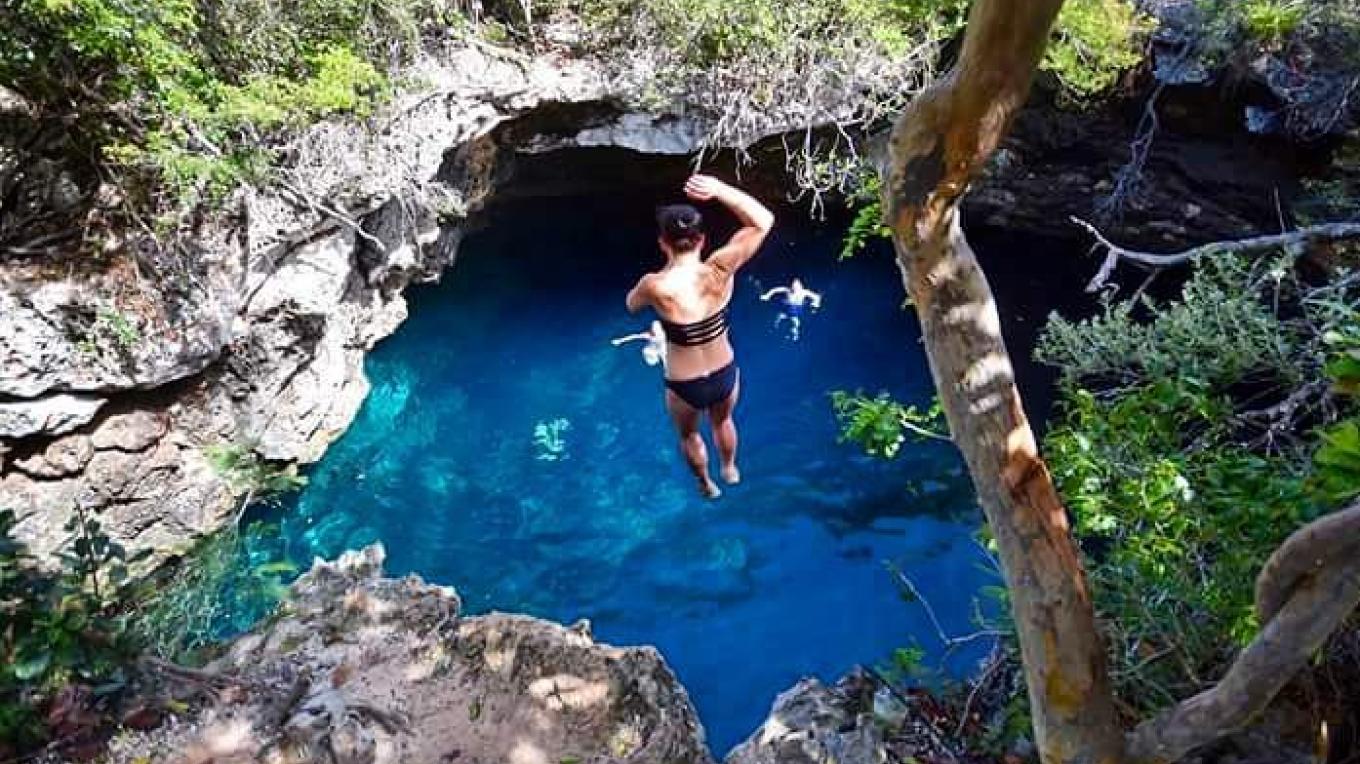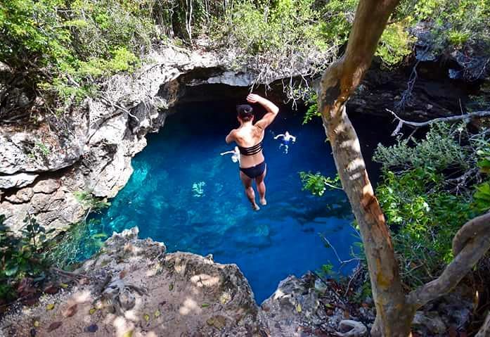 The depth of this Blue Hole is 254 feet, and it is not known to have any marine life due to its inland location. You can fly from a tree swing and cannonball inside the Blue Hole. The perimeter is barely a foot from the water, so you can just as easily step inside. These elusive "Blue Holes," or underwater cave systems, are a diver's mecca.
