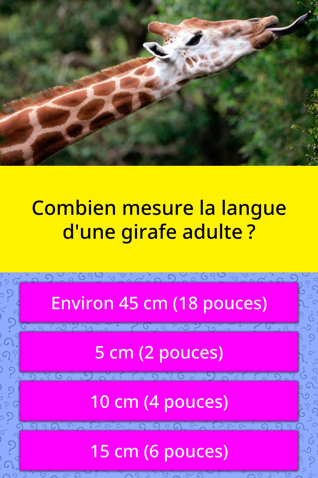Oui sa longueur est impressionnante. Alors, combien mesure cette langue ? La langue d'une girafe adulte mesure autour de 50 cm. Et cette appendice impressionnant se greffe sur un corps immense de 5,50 mètres de haut pour les mâles et 4,30 mètres pour les femelles.