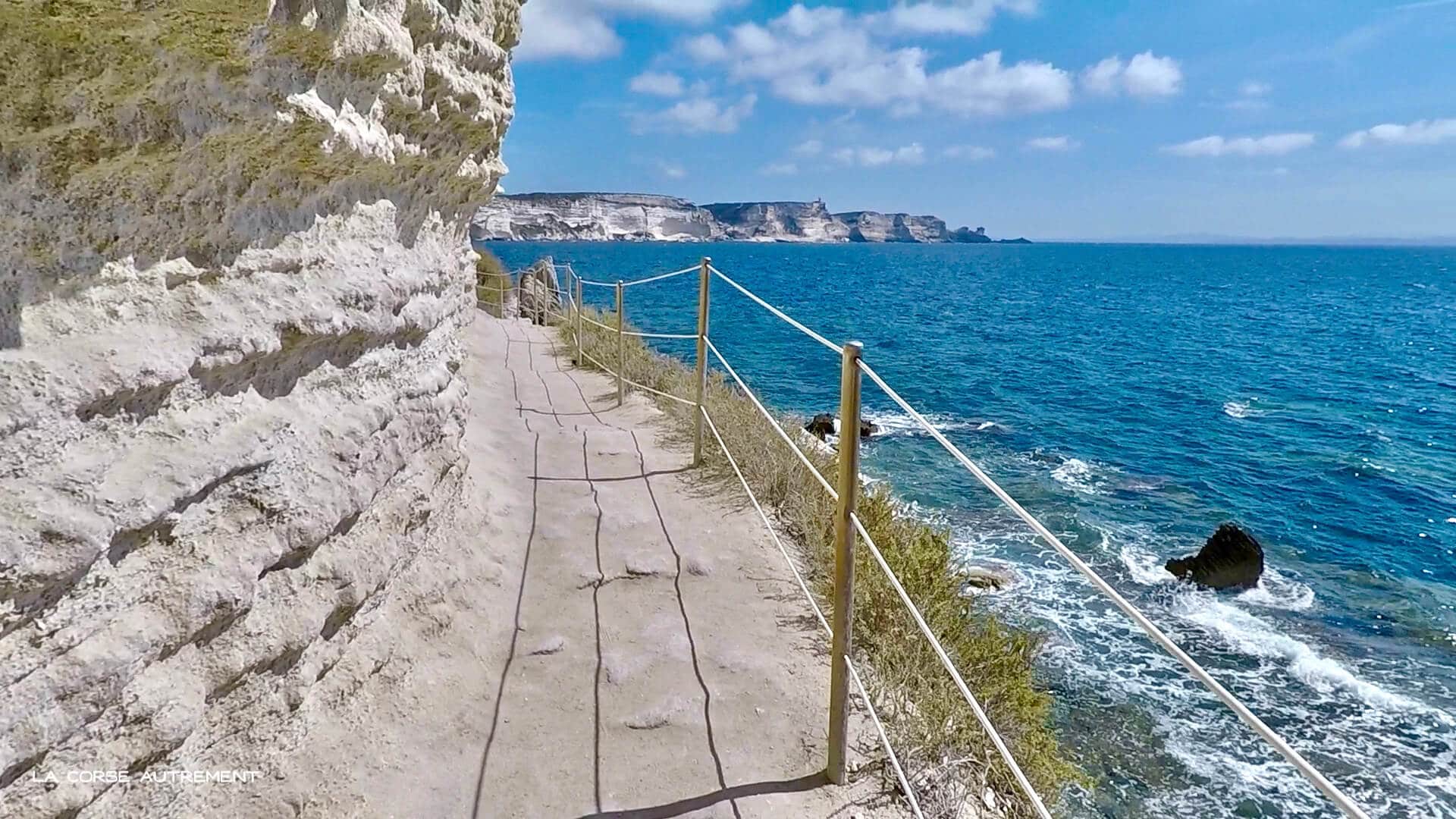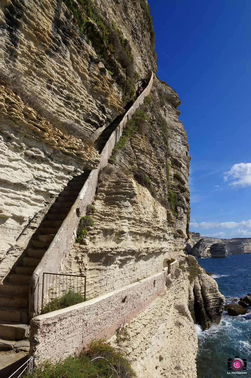 Ce parcours dans la ville de Bonifacio, à l'extrême sud de la Corse, est une balade insolite. Un escalier de 187 marches vous conduit à flanc de falaise, sur un chemin creusé dans la roche qui surplombe les eaux turquoises de la mer Méditerranée. La Légende raconte que les troupes du Roy d'Aragon le creusèrent en une nuit lors du siège de la ville en 1420.