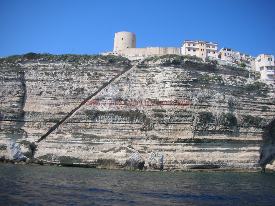 Sud de La Corse. Sites Naturels. Escalier Du Roy D'Aragon. Depuis la mer, cette gigantesque entaille en biais trace sa diagonale sur la roche immaculée : un escalier rectiligne de 187 marches plonge depuis la ville jusqu'au ras des flots, 60 m plus bas. Taillé dans la roche, cet accès se poursuit, en contrebas, par un chemin sécurisé.