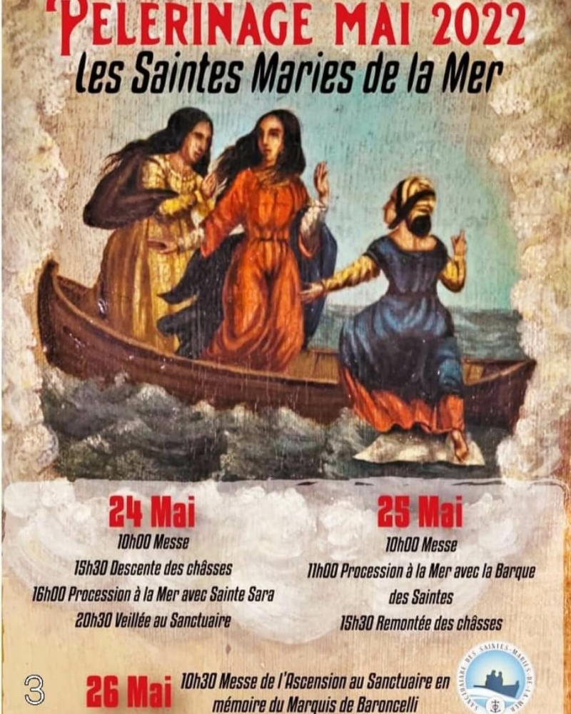 15h30 : Cérémonie de la Descente des Châsses. 16h00 : Procession de Sainte Sara à la mer. 20h30 : Veillée de prières dans l'église. > Samedi 25 Mai. 10h00 : Messe Solennelle des Saintes Maries Jacobé et Salomé. 11h00 : Procession à la plage et bénédiction à la Mer. 15h30 : Cérémonie de la Remontée des Châsses. > Dimanche 26 Mai.