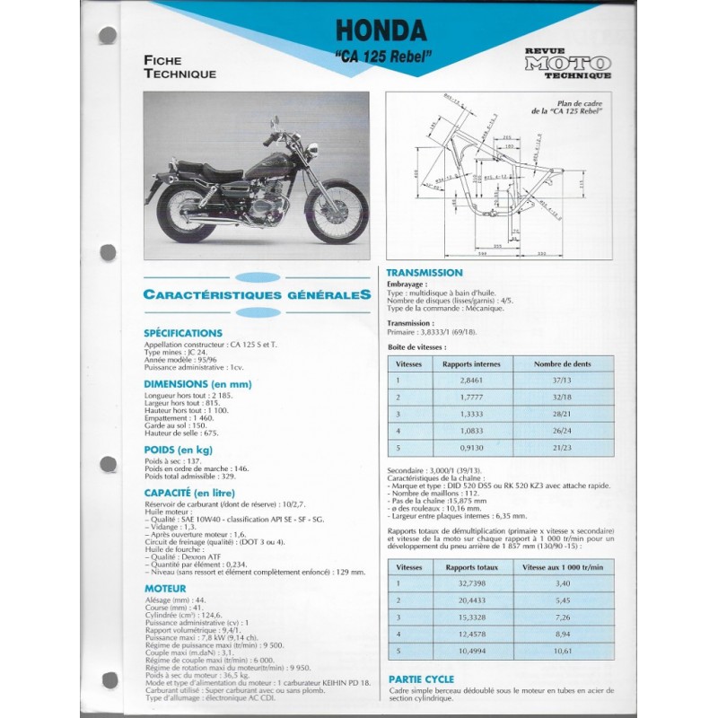 Fiche moto. Honda. CA 125 REBEL. 1996. L'éclosion du mini twin. La Rebel a ouvert la voie à une nouvelle espèce de customs 125 : ceux équipés d\'un bicylindre. Une belle plastique, beaucoup de chromes, et 2 ans de succès, de suprématie même sur le marché 125. Le moteur est souple mais n\'apporte pas de performances spectaculaires à la.