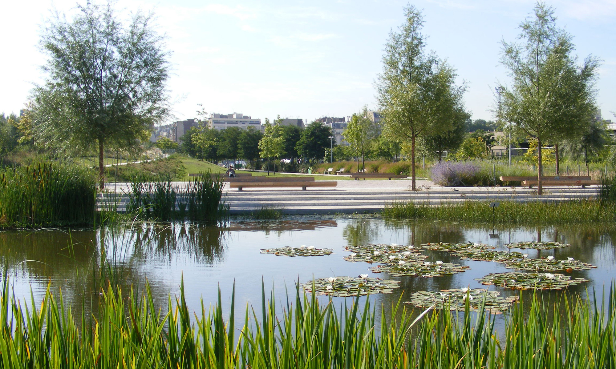 Parc Clichy-Batignolles - Martin Luther King. 147 rue Cardinet - 75017 Paris Batignolles. A park full of surprises: laid out with many original areas, like the Jardin du rail, with its deckchairs, a play area for children and sports ground, or the landscaped water features with their aquatic plants and water margin plants: water lilies, iris.