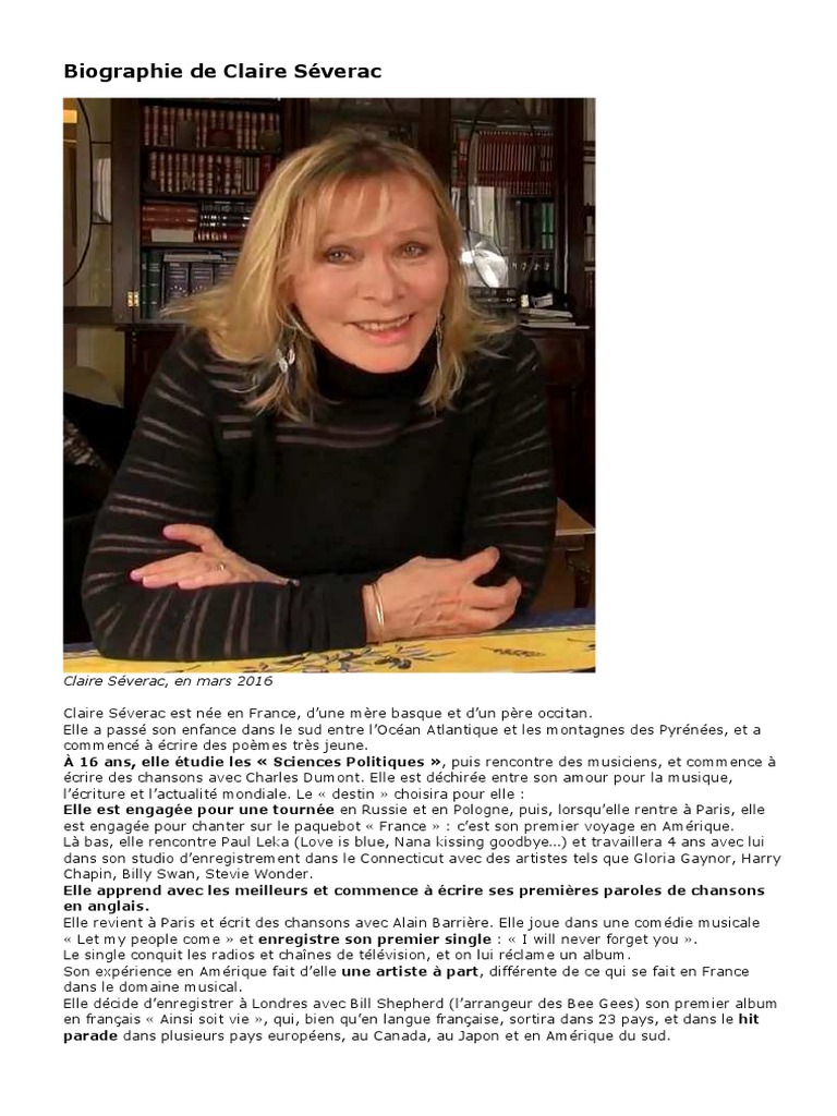 Claire Séverac. De mère Basque et de père Occitan en 1948, Claire Séverac étudie les Sciences Politiques avant de faire une carrière dans la musique aux Etats-Unis. Ses chansons sont enregistrées par des artistes aussi connus que Pat Benatar, Donna Summer, Emmylou Harris, Willy Deville, Chicago.